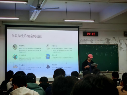 在消防安全与反诈宣传主题班会中,各年级辅导员通过图文并茂、直观生动的演示,向学生强调宿舍安全用电方法,揭露常见诈骗手段。同时,结合近期我院学生被诈骗的真实案例,详细讲解了诈骗分子的作案套路和识别技巧,声称“订单异常”“商品质量问题”,要求私加微信、发链接等都是诈骗。此外,还鼓励学生争当反诈宣传员,提醒身边同学提高警惕,遇可疑情况及时向学校或公安机关求助。