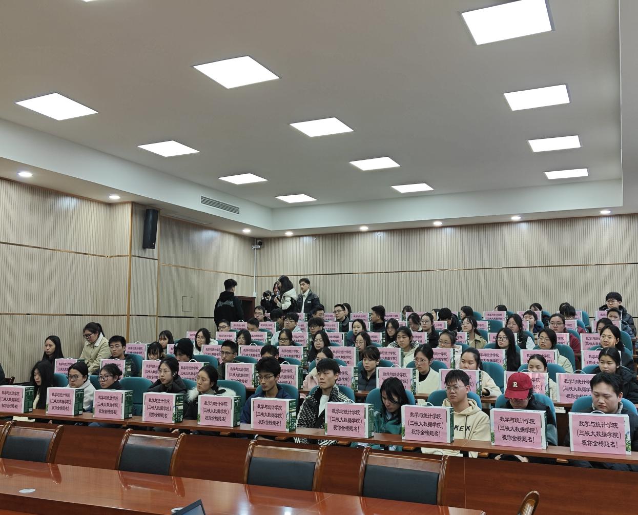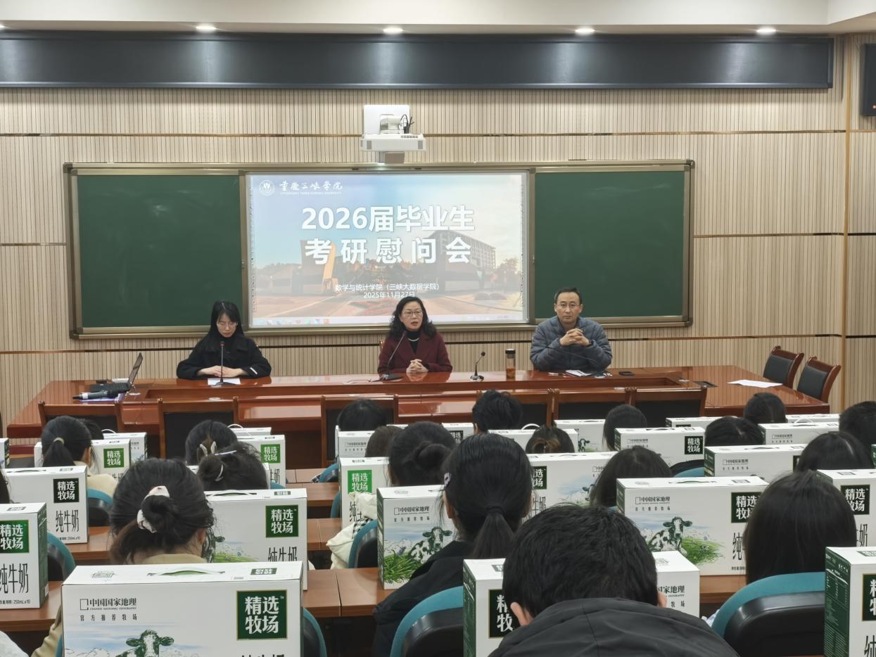 为帮助考研学子缓解备考压力,鼓舞考研士气,坚定考研信心。数学与统计学院(三峡大数据学院)于11月27日在明辨1栋104会议室开展了2026届毕业生考研慰问,为冲刺阶段的考研学生送上暖心礼包。学院党总支书记黄明靖、副院长刘金魁及100余名考研学生参加,会议由毕业班辅导员唐文倩主持。
